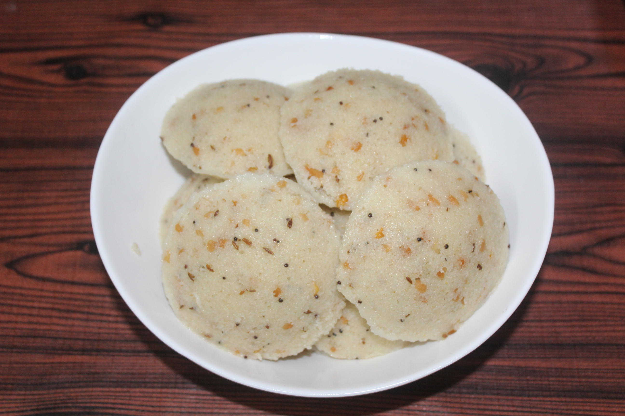 A bowl of rava idly, soft and round, garnished with spices, served on a wooden table.